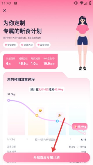 3、确认计划内容后,点击【开启首周专属计划】,就能够启动专属的断食计划。